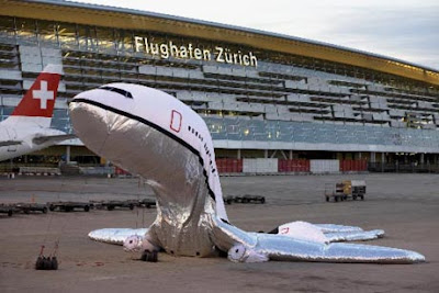 It loos like airplane, and it can fly too, but it isnt real, what it can be? Simly this is balloon airplane, who was setup on Zurich airport (Flughafen Zurich).
