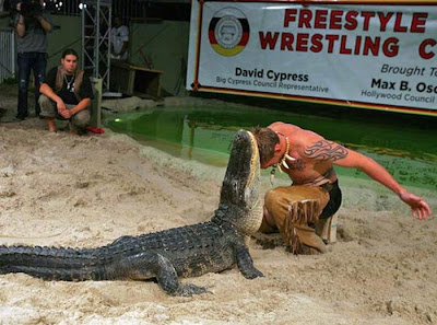 Alligator wrestlers have ten minutes to get the alligator out of its water-hole, somehow drag it to dry land, where each shows off a series of tricks, like kissing the gators or placing their heads and hands between the reptiles’ jaws. The prize money for this sort of competition adds up to around $10,000.