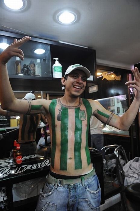 25-year-old Colombian soccer fan Felipe Alvarez has been tattooed with a soccer jersey tattoo of Atletico Nacional team in honor of Andres Escobar, a Columbian soccer player who was killed in 1994. It is widely believed that he was murdered due to his own goal in the 1994 FIFA World Cup, which supposedly would have caused gambling losses to several powerful drug lords. In that game Columbia has lost 1:2 to the USA and was eliminated from the tournament in the first round. Anyway, it's the craziest tattoo I've seen in a while.